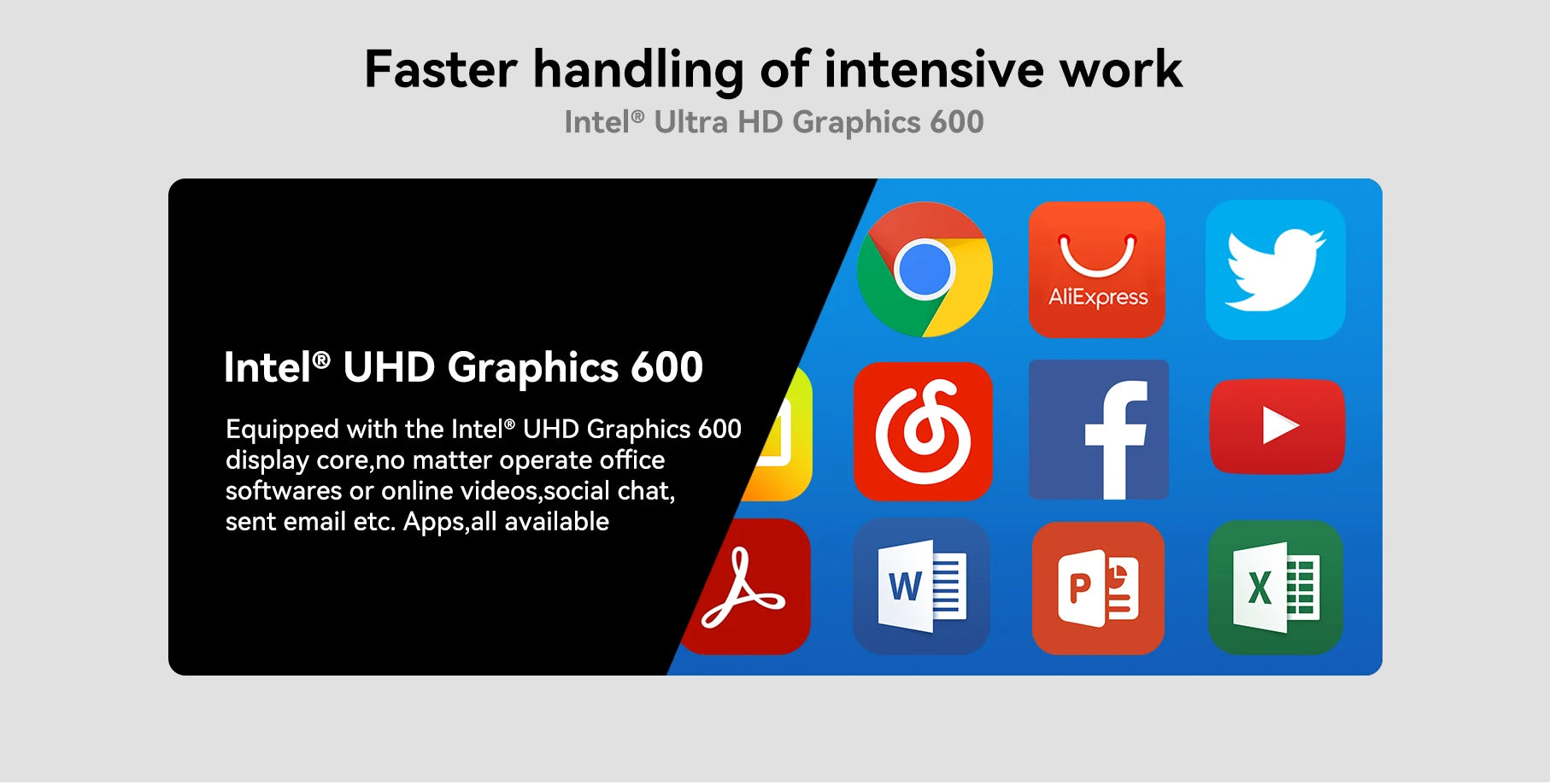 Equipped with the Intel® UHD Graphics 600 display core,no matter operate office softwares or online videos,social chat, sent email etc. Apps,all available