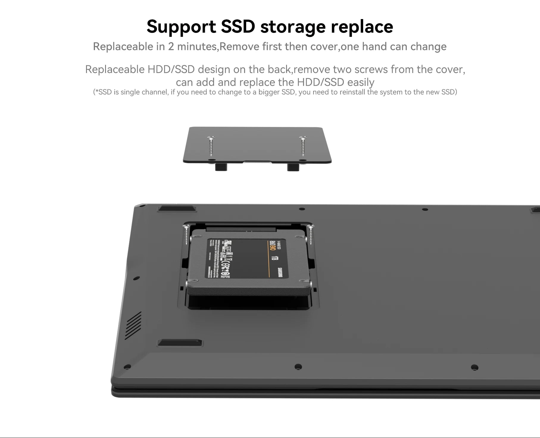 Replaceable HDD/SSD design on the back,remove two screws from the cover, can add and replace the HDD/SSD easily