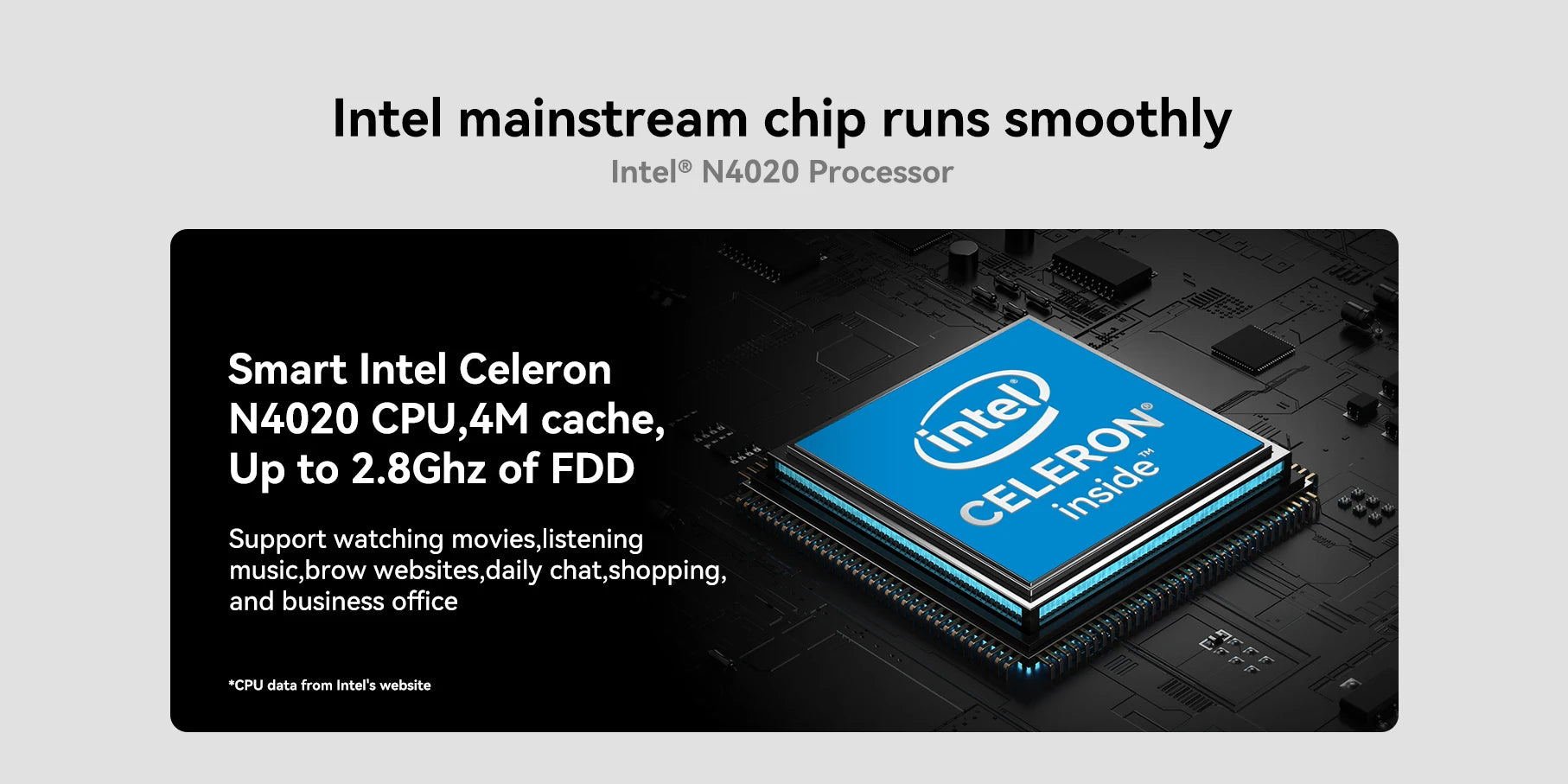Smart Intel Celeron N4020 CPU,4M cache,Up to 2.8Ghz