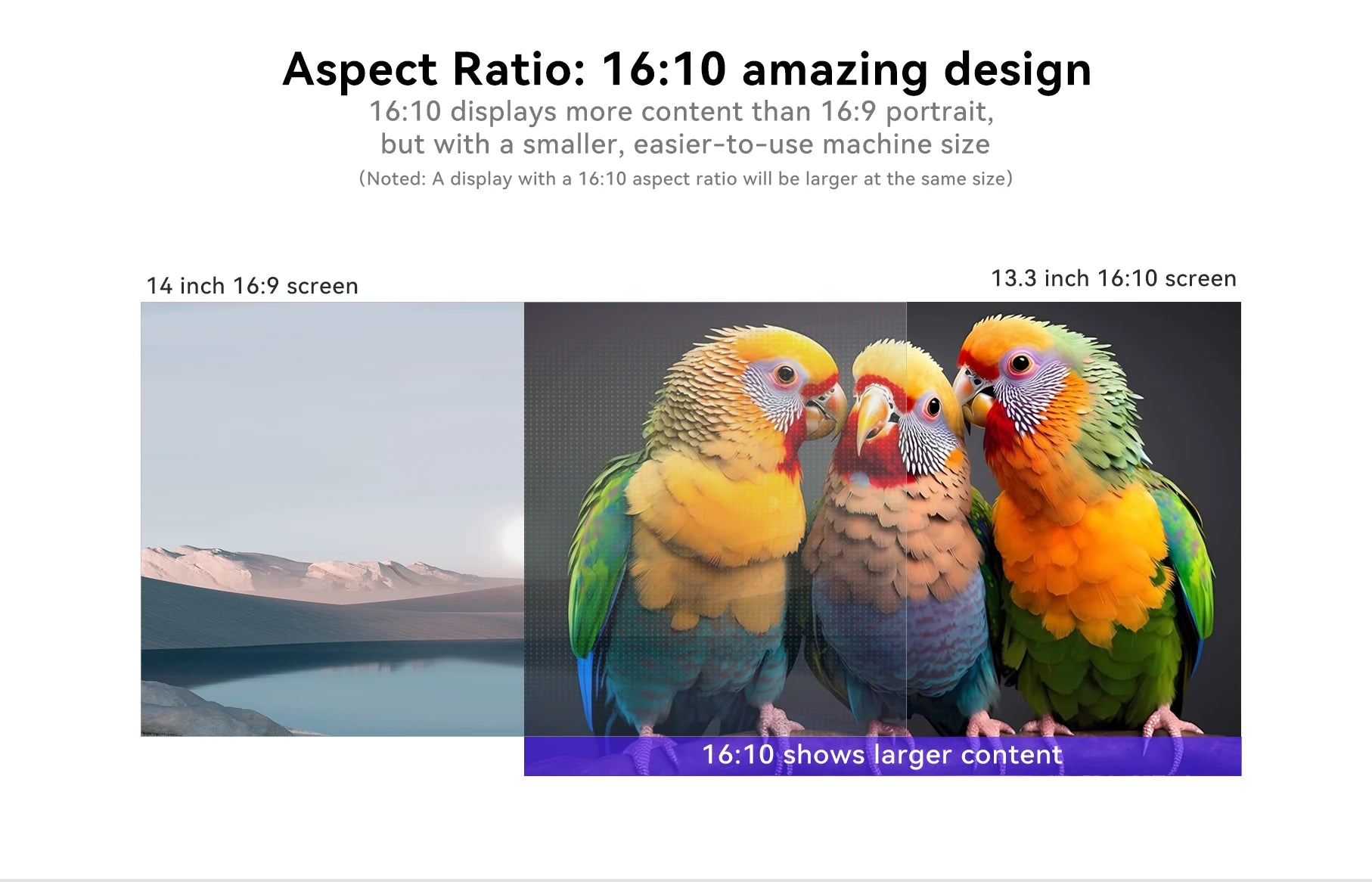 16:10 displays more content than 16:9 portrait, but with a smaller, easier-to-use machine size (Noted: A display with a 16:10 aspect ratio will be larger at the same size)