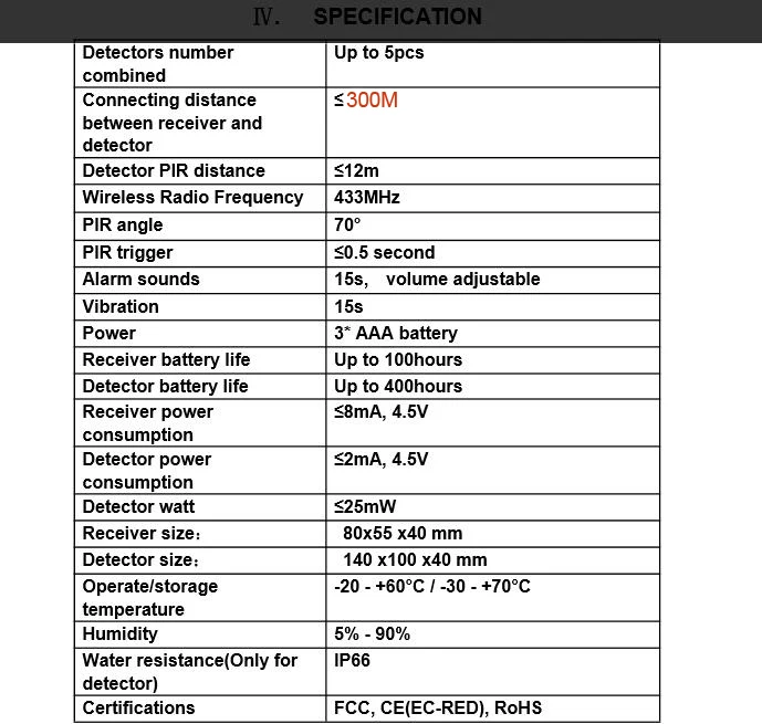 Bestguarder SY-007Plus is a wireless alarm system contains one 433MHz wireless receiver and five passive infra-red (PIR) motion detectors, when the detector is triggered by a motion in 0-15M open distance, a wireless signal within a maximum range of 300M is transmitted to the receiver, a 15 seconds vibration, a 15 seconds LED light and a 15 seconds sound can identify which detector has been triggered.