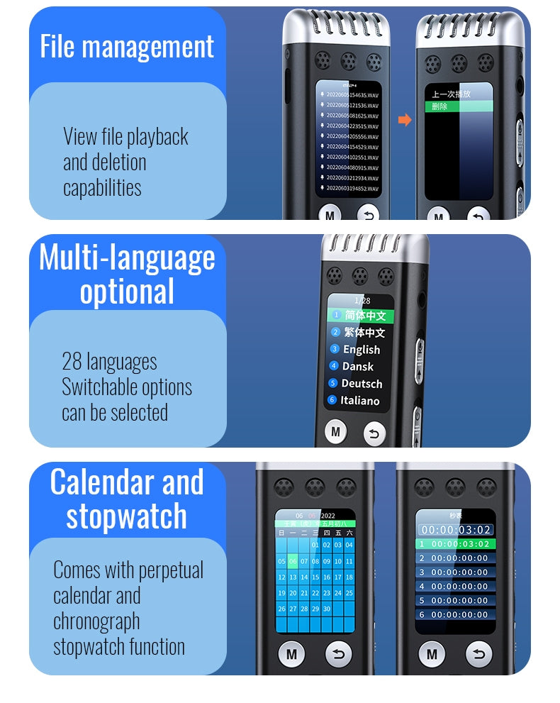 4. High-definition long-distance stereo pickup technology, as long as the ear can hear the sound, the recorder can record clearly. No restrictions on the environment.