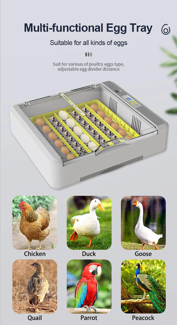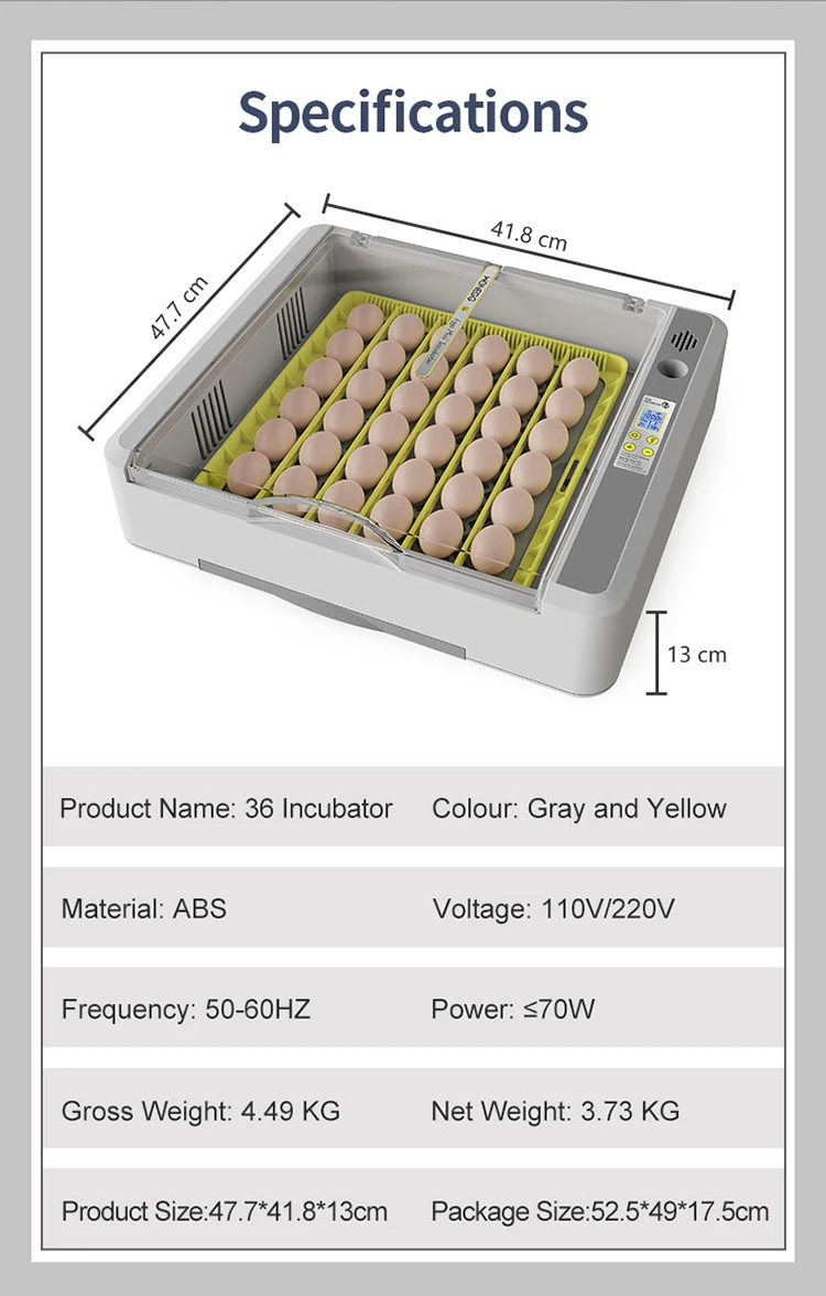 Capacity: 36 chicken eggs/25 duck eggs/ 12 goose eggs/120 quail eggs