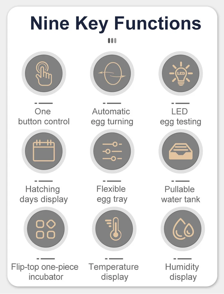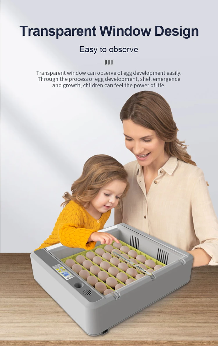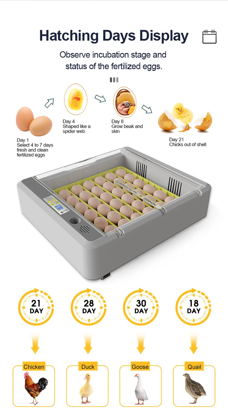 3.Automatic Egg Turning : Incubator comes equipped with an automatic egg turner that replicates the natural behavior of a hen carefully rotating its eggs, promoting the healthy development of your fertilized eggs.