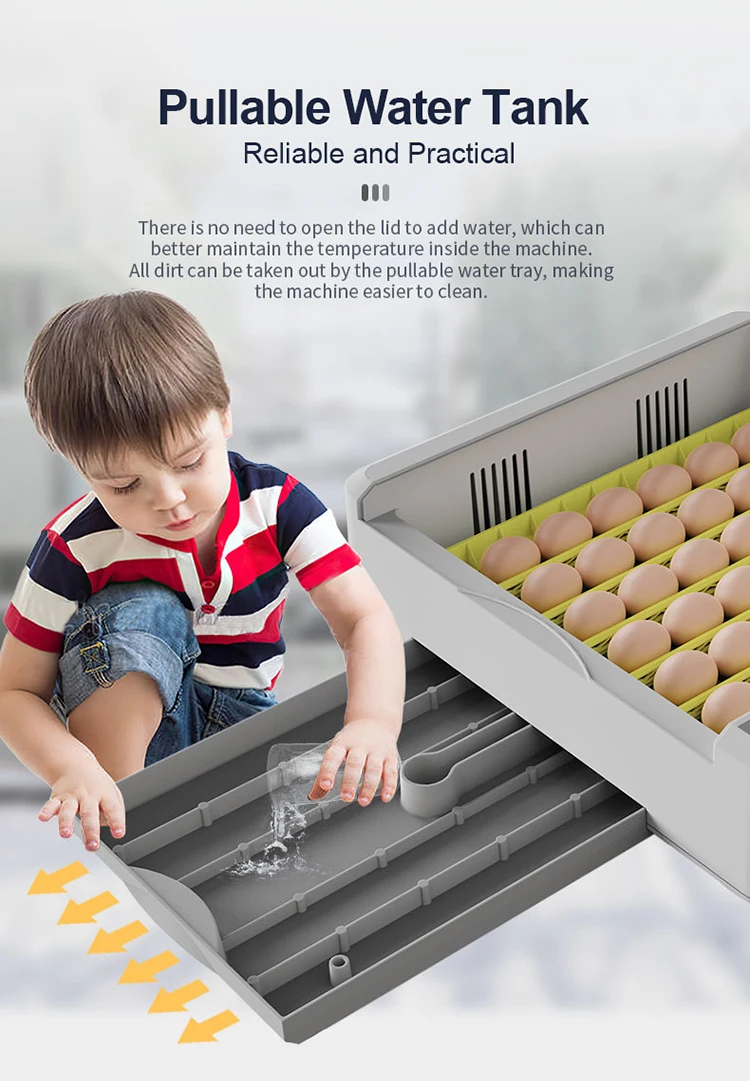 5.Pull Out Water TRAY : The water tray is embedded in the bottom of the incubator, you just need to follow the instructions to add the right amount of water on the water tray, the circulating airflow will make the incubator humidity uniform, and you can watch the humidity through the screen, this design is very convenient.